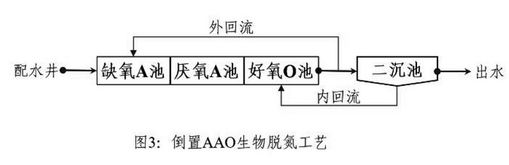 AAO工藝亦稱A2O工藝,是英文Anaerobic-Anoxic-Oxic首字母的簡稱,即:厭氧—缺氧—好氧工藝;而倒置AAO工藝是將缺氧工藝置于厭氧工藝之前(如圖3)。