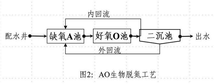 現(xiàn)行的污水處理廠一般采用AO工藝或AAO工藝作為生物脫氮的工藝流程。AO生物脫氮指的是缺氧—好氧(Anoxic-Oxic)工藝,其主要特點(diǎn)是用于反硝化脫氮反應(yīng)器置于系統(tǒng)之首,故稱之為前置反硝化生物脫氮系統(tǒng)(如圖2)。